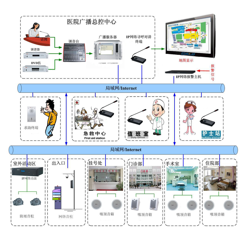 l 醫院IP網絡廣播系統基于醫院局域網或互聯網建設,提高系統整體性能(néng),達到背景音樂 及業務公共廣播的要求; l 門診大樓、綜合辦公樓、住院部、急救中心、室外園區等每個區域設計數字IP功放,并 置不同規格的廣播音箱 。廣播系統利用網絡可實現手動、自動(分區)播放舒緩的背景音樂、疾病預防常識,或播放通知、找人等; l 各科室設立分控終端,分管本部門的廣播業務并接受主控中心的管理; l 室外活動區域設置求助報警點,緊急情況下,可通過(guò)該設備向(xiàng)監控中心求助,并實現雙向(xiàng) 可視對(duì)講; 與醫院消防系統聯動,當遇到火警或者其它緊急狀況時(shí),實現緊急報警廣播,系統切斷正 在播放的音樂,優先通知醫院的醫護人員和病人撤離現場。