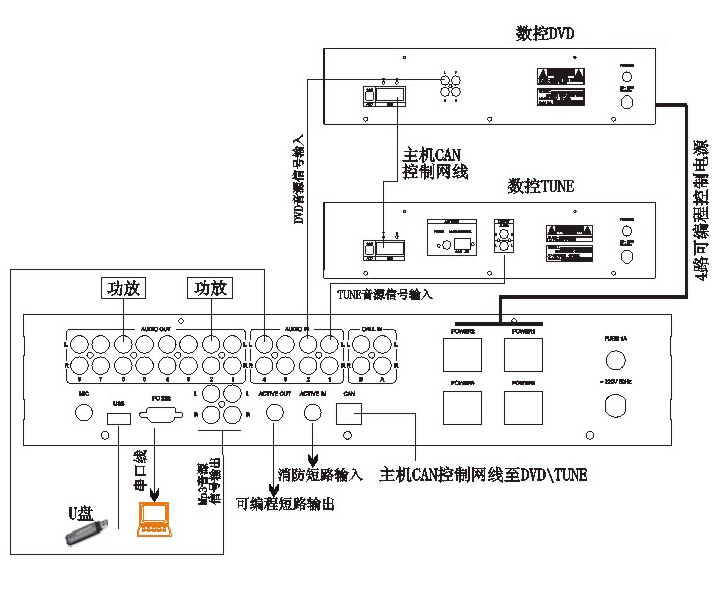 系統概述: KD-5211可實現定時(shí)、分區、定節目、多音源及消防緊急廣播等功能(néng),系統集編程控制、矩陣、功放輸出等功能(néng)于一身,可實現定時(shí)開(kāi)啓、關閉、自動運行所編程序、自動播放廣播内容,當緊急災害發(fā)生時(shí),系統可自動強行插入緊急廣播。 功能(néng)特點: ●7路音源輸入,16路矩陣分區輸出。其中2路輸入音源帶MIC和LINE,MIC優先線路LINE;5路普通背景音源輸入音源輸入帶前置放大及音量調節 ●能(néng)同時(shí)接入2個話筒輸入,而且這(zhè)兩(liǎng)個話筒分别能(néng)默音2 路線路輸入。話筒進(jìn)行廣播的時(shí)候,背景音樂聲音自動減小,反之無廣播時(shí),背景音樂聲音自動增大 ●内置MP3播放模塊。外接U盤,即能(néng)實現定時(shí)自動播放。U盤的MP3播放文件按文件名排序001、002等 ●可以脫離電腦單獨使用,也可以結合電腦一起(qǐ)使用,同時(shí)也可以配合遠程尋呼站使用 ●靈活的手動控制,設有10個可編程的快捷鍵 ●可以外控其它受控的周邊設備:如DVD、調諧器TUNE、電源管理器等 ●可以編輯8套不同程序,每套程序均達220步。每步操作精确到秒 ●一路短路(消防全區報警)輸入,一路可編程的短路輸出(可以觸發(fā)電源時(shí)序器等) ●内置0.5W監聽,能(néng)監聽16分區的輸出,也可以監聽6路音源的輸入,或外部音源設備輸入 ●本地廣播尋呼功能(néng),可靈活實現分區、分組、全區廣播尋呼 。對(duì)于常用的尋呼操作,可把這(zhè)種(zhǒng)操作編輯爲一個快捷鍵來完成(chéng),簡化操作 ●配合呼叫(jiào)站可進(jìn)行遠程尋呼廣播;呼叫(jiào)站同時(shí)具備分控功能(néng)。能(néng)接入4台(可擴展) ●可配合無線遙控器簡單快捷操作 (功能(néng)同快捷鍵F1-F4空曠距離1000米 ●四路可控電源輸出 4 x AC220V(3A) ●可外接電話接入器,進(jìn)行遠程電話分區、分組、全區,電話有語音提示 ●多模式消防報警功能(néng),N±0\1\2\3\4\全區等6種(zhǒng)報警模式 ●可外接擴展機箱,擴展機箱可接入不同模塊,如MP3模塊,電話輸入模塊,消防接入模塊等 ●設鎖功能(néng),防止非法操作