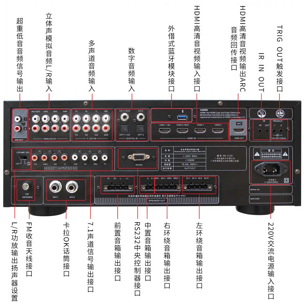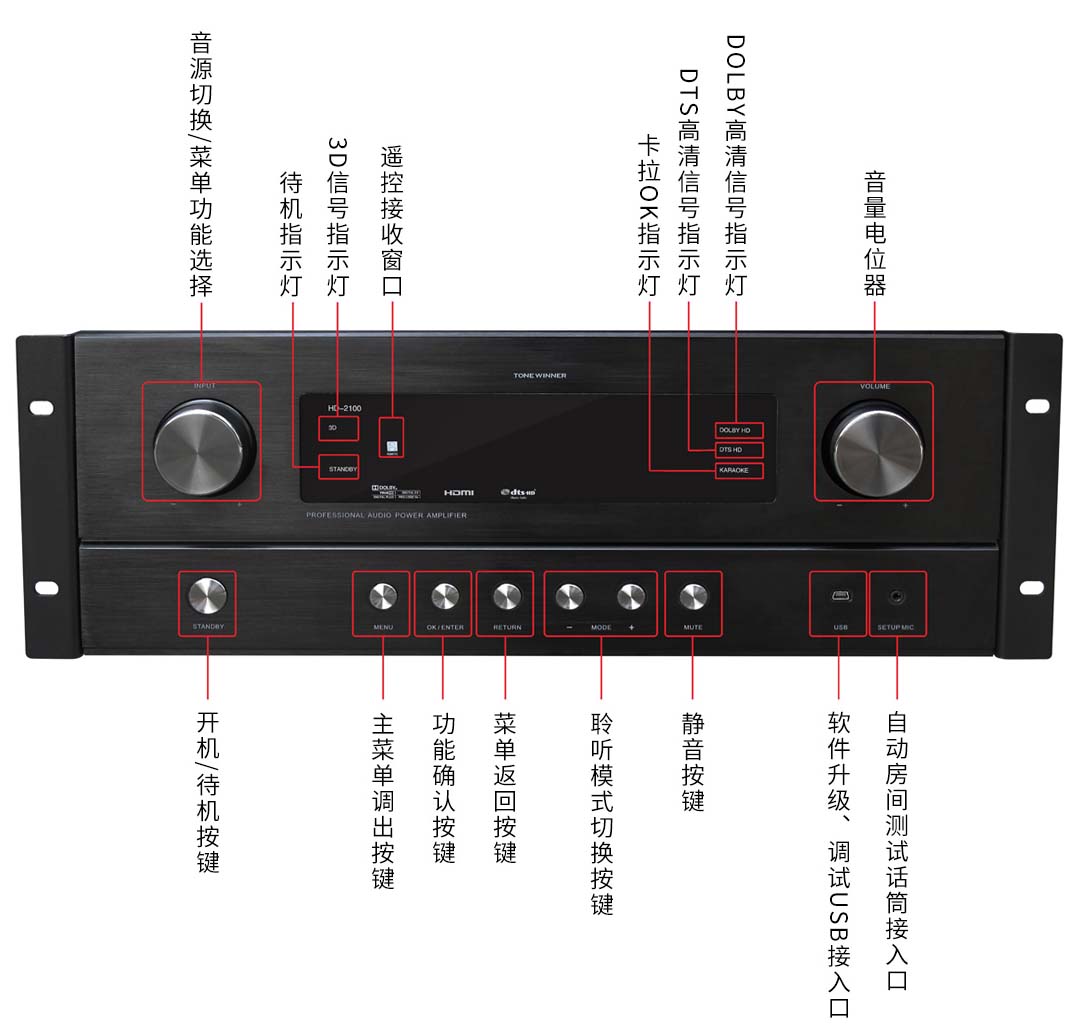 HD-2100作爲标準5.1影院功放系統,同時(shí)具備7.1信号輸出,讓以後(hòu)的升級無憂。卡拉OK系統輸出時(shí)是